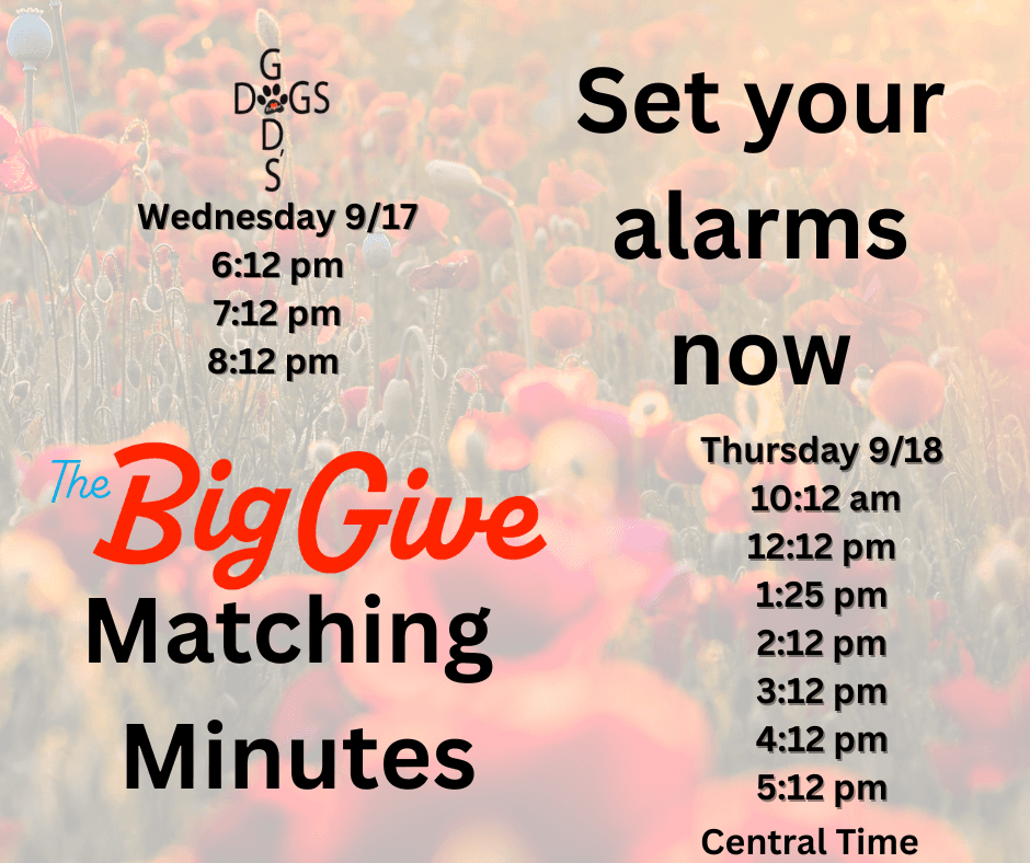 Our biggest fundraiser of the year is open now Join us for the Central Time Matching Minutes to make your donations go farther: Wednesday 9/17/25 6:12 pm 7:12 pm 8:12 pm Thursday 9/18/25 10:12 am 12:12 pm 1:25 pm 2:12 pm 3:12 pm 4:12 pm 5:12 pm
